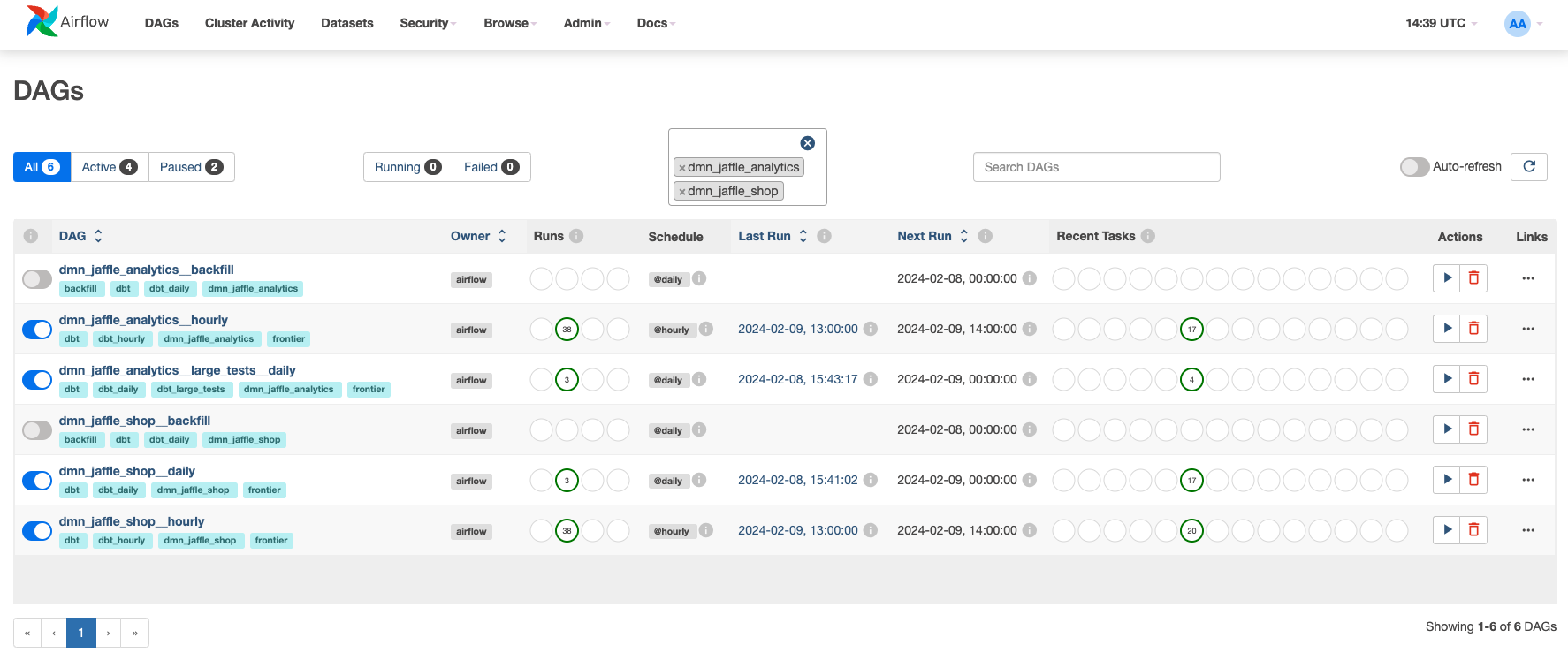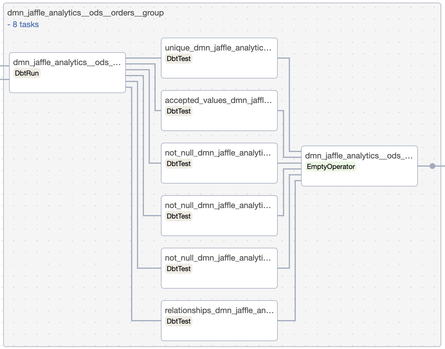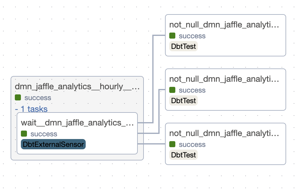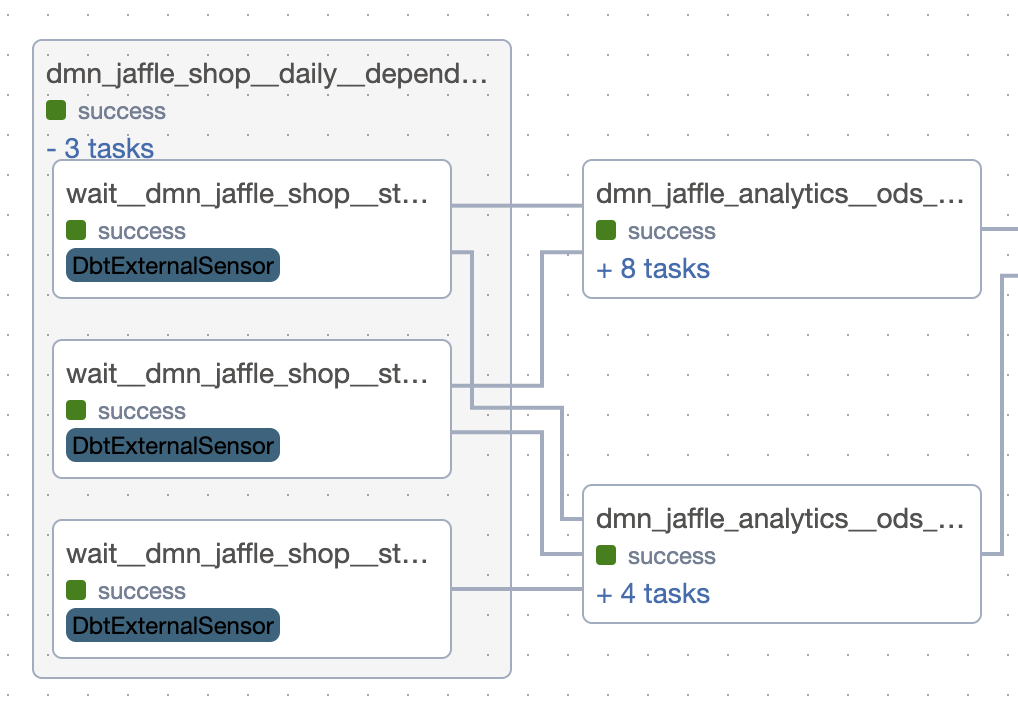 All models in dmn_jaffle_analytics.ods refer models from dmn_jaffle_shop.ods. This will create for each dependency a group with sensors to start execution of the dependent group only when the upstream models are finished.